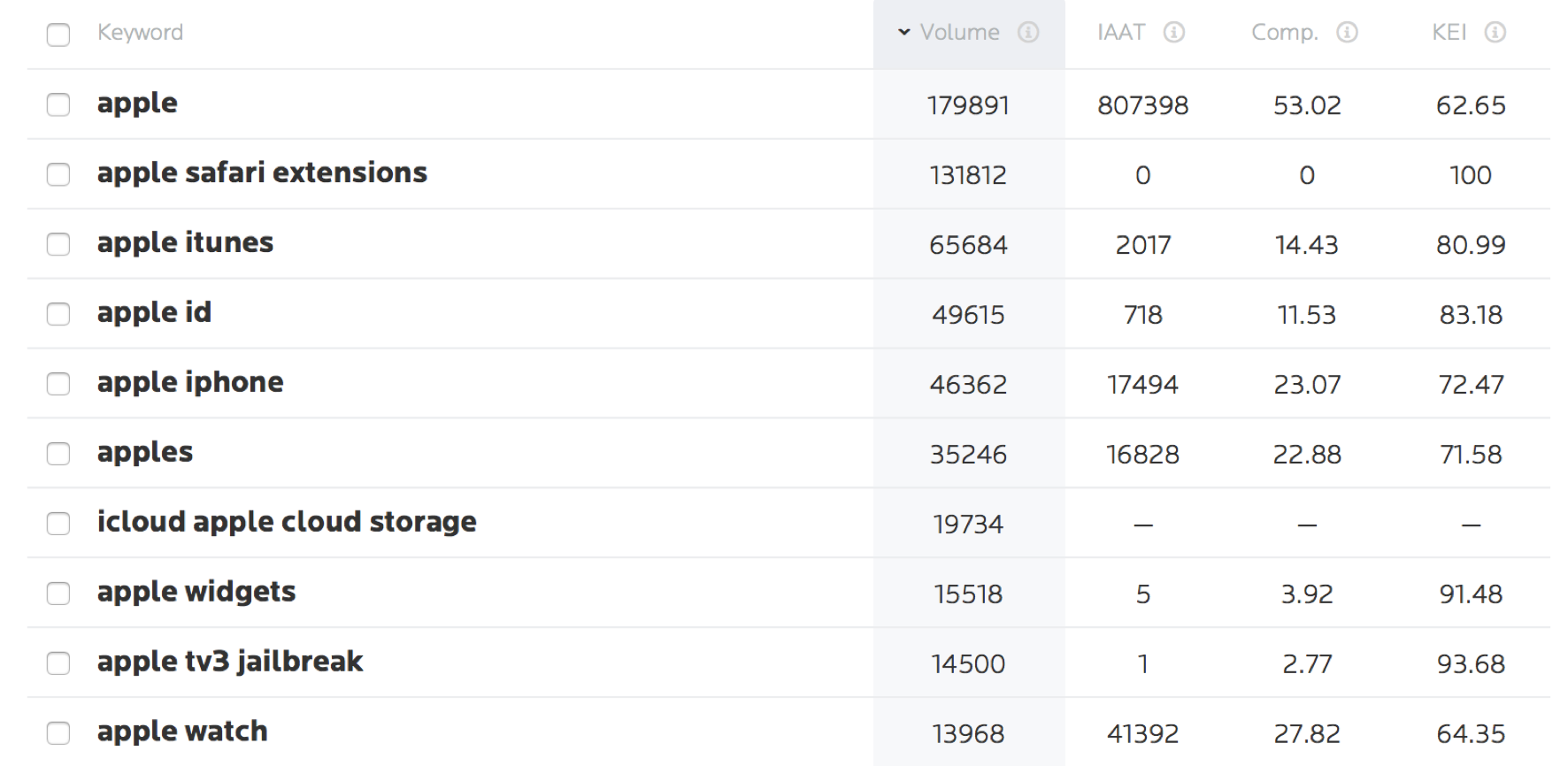 What you can do is use search terms that have the same search volume as “apple”, but aren’t as competitive. There are many tools help you figure out search volume, one such tool is Wordtracker, the following screenshot shows how you can use this information.
