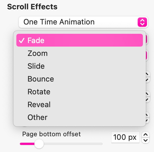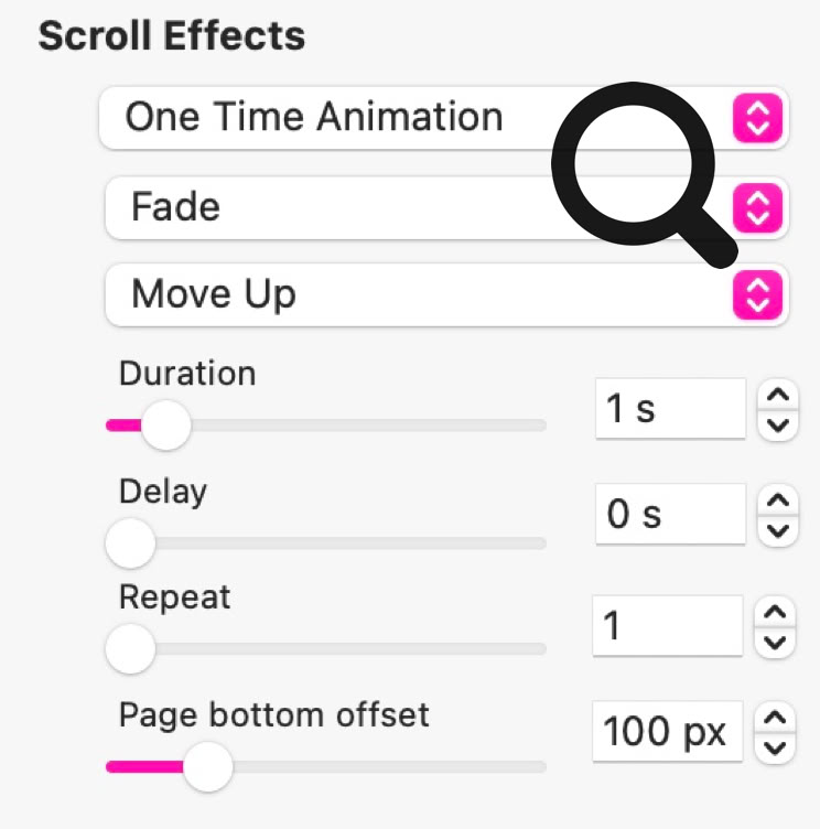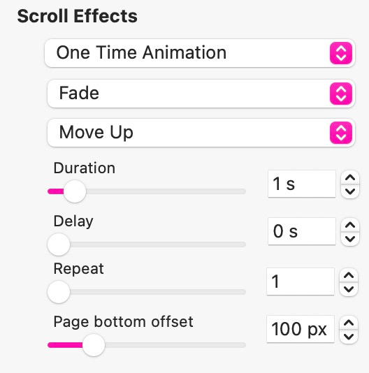 Jeder Effekt hat eigene Einstellungen, etwa die Geschwindigkeit bei Scrolleffekten oder den Rotationswinkel. Durch das Kombinieren mehrerer Effekte können Sie sehr kreativ werden und Ihre Website richtig hervorheben!