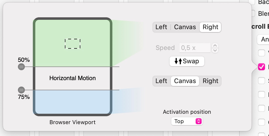 Rechts im Popup befinden sich effektbezogene Einstellungen. In unserem Beispiel der vertikalen Bewegung haben wir eine Geschwindigkeit von 1,5-mal der Scroll-Geschwindigkeit gewählt und festgelegt, dass die Animation startet, wenn die Unterkante des Elements in das „Aktionsfenster“ eintritt. Das Ergebnis: Sobald die Unterkante des Elements die 75%-Marke überschreitet, beginnt es, sich nach oben zu bewegen, bis es die 60%-Marke erreicht. Dann stoppt es. Dabei wird angenommen, dass der Startpunkt der Bewegung die Position ist, an der das Element auf dem Canvas platziert wurde. Möchten wir jedoch, dass es früher startet und seine Bewegung an der Canvas-Position endet, klicken wir auf die Schaltfläche „Swap“, um den Effekt umzudrehen. Das Element beginnt dann unterhalb seiner aktuellen Canvas-Position und bewegt sich nach oben in seine Canvas-Position. Der Startpunkt der Bewegung wird durch den unteren Zonenmarker bestimmt.