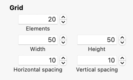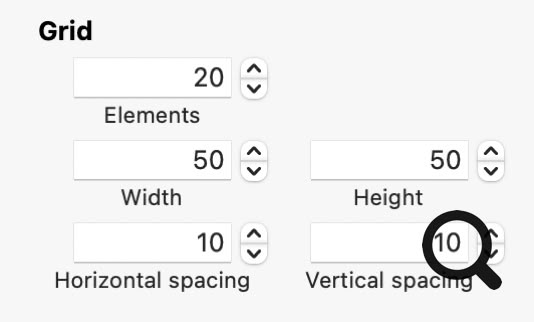 Das Obige wurde erreicht, indem die Zellen auf 50 px Breite, 50 px Höhe sowie einen vertikalen und horizontalen Abstand von 10 px eingestellt wurden – alles im Stil-Panel.
