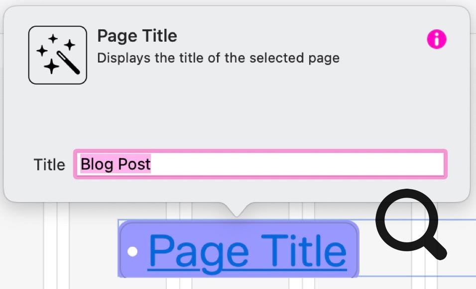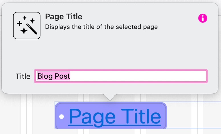 Dasselbe können Sie für das Datum und den Textkörper des Blog-Beitrags tun. Das Datum ist im Stil Blog-Metadaten formatiert, der Beitragstext verwendet den Standard-Fließtextstil Ihrer Website. Wenn Sie auf der Arbeitsfläche ZWEIMAL auf die Überschrift des Blog-Beitrags klicken, wird sie zu Seitentitel. Klicken Sie ein drittes Mal, erscheint ein kleines Popup, in dem Sie einen Titel für Ihren Blog-Beitrag vergeben können.