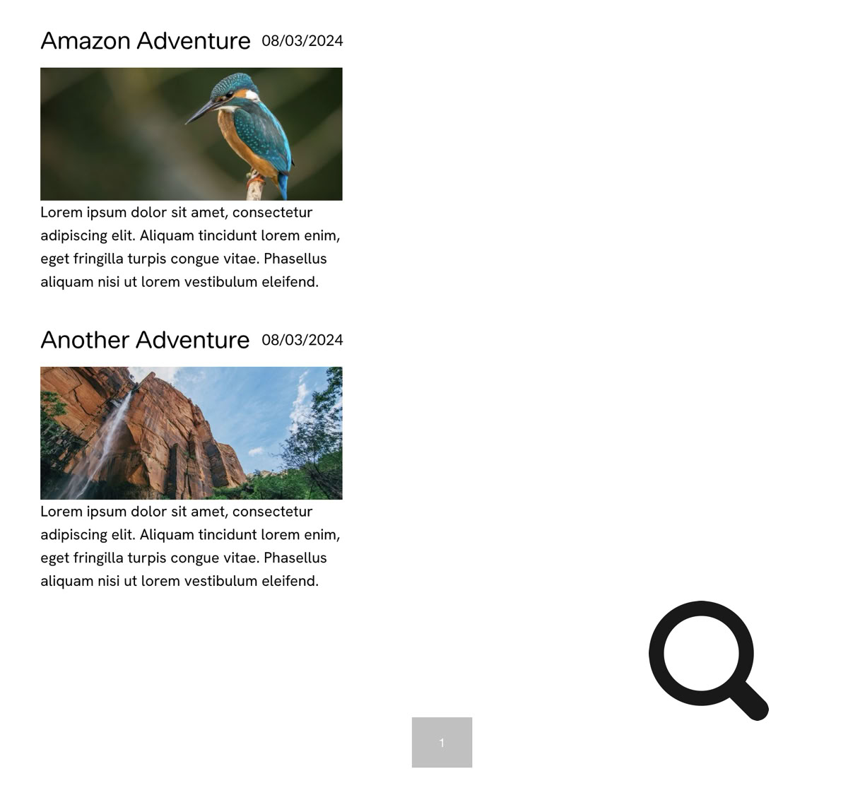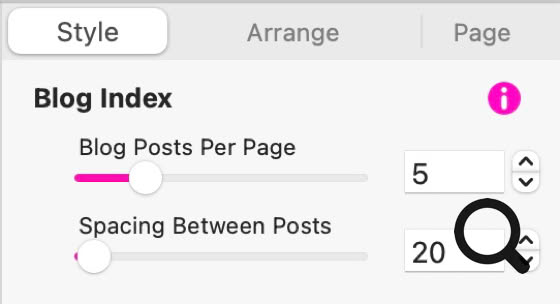 Damit sind wir aber noch nicht fertig. Wenn Sie zur Blog-Indexseite zurückkehren, sehen Sie den Zusammenfassungseintrag auf der Seite. Er befindet sich in einem eigenen Kasten, sodass Sie ihn auf der Indexseite verschieben können, um ihn an andere Seitenelemente anzupassen. Unter dem Eintrag wird außerdem eine Seitenschaltfläche angezeigt. Wenn Sie weitere Blog-Beiträge hinzufügen, füllt sich die Indexseite. Sie können die Anzahl der pro Index anzuzeigenden Beiträge festlegen, indem Sie den Index-Kasten auf der Seite auswählen und im Stil-Panel die Anzahl und den Abstand der Einträge einstellen. Sobald diese Anzahl erreicht ist, erstellt Sitely zusätzliche Indexseiten und fügt der Seiten-Navigation weitere Buttons hinzu. So können Nutzer durch alle bisherigen Blog-Beiträge blättern.
