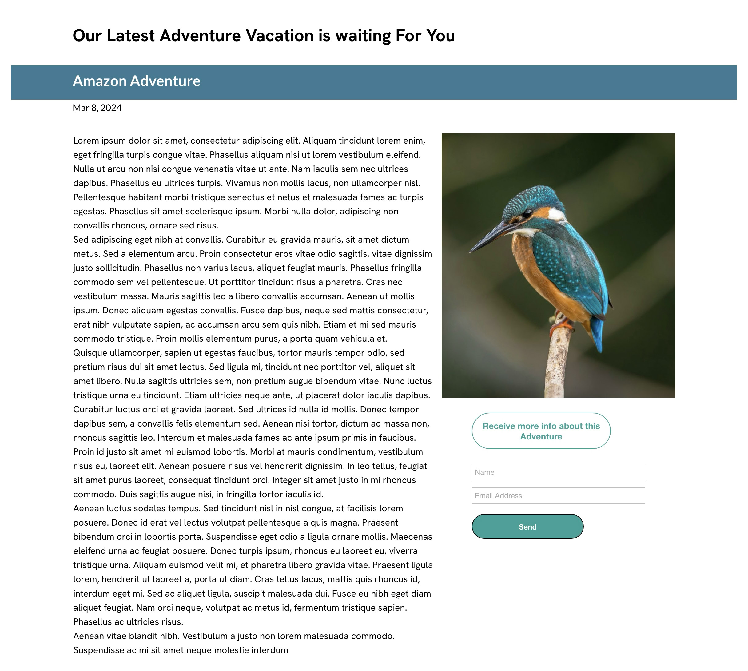 Im obigen Beispiel wurde der Blogtitel gestaltet und über einer Hintergrundbox platziert. Außerdem wurden ein Bild und ein kurzes Anfrageformular hinzugefügt. Denken Sie daran: Sie können Ihre Seite nach Belieben strukturieren – wie jede andere Seite in Sitely. Das Einzige, was Sie ZUSÄTZLICH hinzufügen MÜSSEN, ist ein Link zum Blog-Index. Das kann ein Button oder ein Textlink sein, der Nutzer zur Indexseite Ihres Blogs zurückführt. Typischerweise sieht der Link in etwa so aus und hat als On-Click-Aktion Zum Blog-Index gehen.
