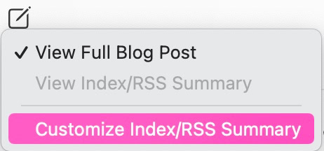 Nachdem Sie Ihren ersten Beitrag erstellt haben, sollten Sie die Blog-Indexseite prüfen. Als Erstes fällt auf, dass sie identisch aussieht mit der soeben erstellten Blog-Beitragsseite – ergänzt um einige Buttons am unteren Rand. Das wäre natürlich kein typisches Layout für eine Blog-Indexseite. Stattdessen möchten Sie wahrscheinlich eine kurze Zusammenfassung der Seite anzeigen, eventuell mit einem kleinen Vorschaubild. In manchen Fällen sollen nur Titel und Datum des Beitrags in einem Bereich wie Aktuelle Nachrichten auf der Indexseite erscheinen. Das lässt sich in Sitely ganz einfach umsetzen. Gehen Sie zurück zur Blog-Beitragsseite und suchen Sie oben links auf der Arbeitsfläche nach einem Symbol – es sieht aus wie das Blog-Symbol, mit dem Sie den Blog erstellt haben, bietet aber andere Optionen – so wie dieses.