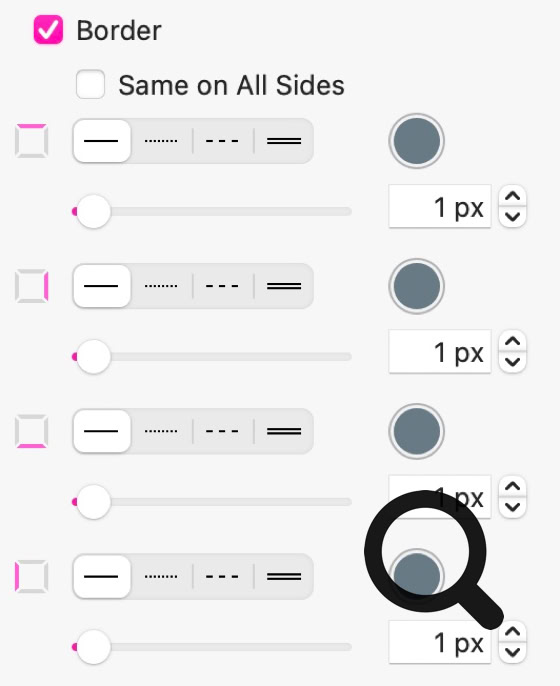 Rand: Mit dieser Option fügen Sie Ihrer Box einen Rand hinzu. Sie können den Rand auf allen Seiten gleich einstellen oder für jede Seite Ihrer Box einen eigenen Stil/Dicke/Farbe wählen.