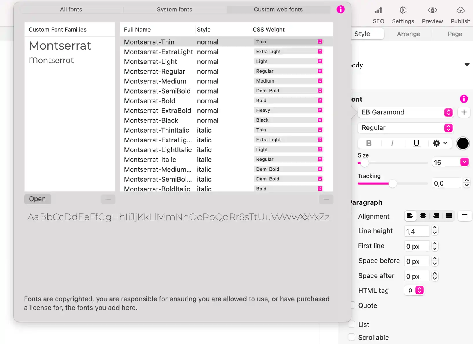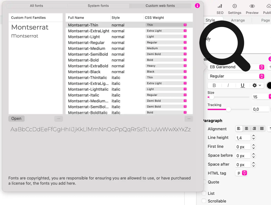 In Sitely haben Sie Zugriff auf über 1.600 Webfonts über Googles Webfonts-Projekt, die Sie mit nur einem Klick installieren können. Außerdem können Sie Systemschriften verwenden oder eigene Webfonts in Sitely hochladen..