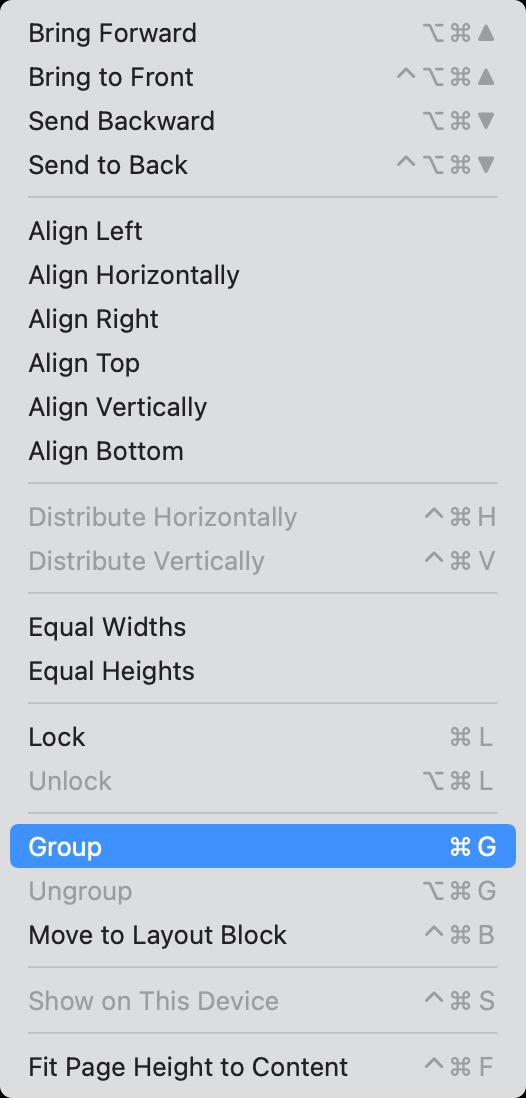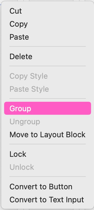 Mehrere Elemente können zu einer Gruppe zusammengefasst werden, sodass Sie sie als Einheit verschieben und in der Größe ändern können. Wählen Sie dazu alle zu gruppierenden Elemente aus und öffnen Sie per Rechtsklick bzw. Ctrl-Klick das Kontextmenü. Wählen Sie dann 'Gruppieren'. Sie können Elemente auch gruppieren, indem Sie sie markieren und die Gruppenoption im Sitely-Menü 'Anordnen' verwenden. Das Sperren eines Elements (einschließlich Gruppen) verhindert, dass es versehentlich verschoben, geändert oder gelöscht wird – entweder über das Menü 'Anordnen' oder im Anordnen-Inspektor.