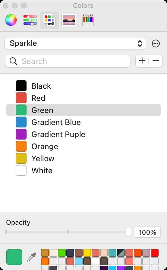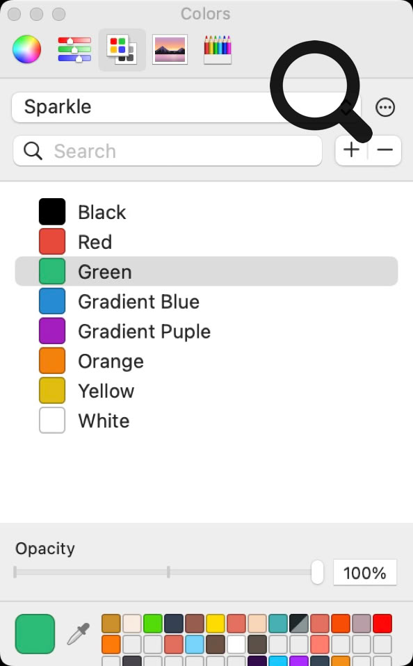 Eine weitere Möglichkeit, Farben zu bearbeiten, ist Apples integrierter Farbwähler. Sie gelangen dorthin, indem Sie im Farbpanel auf das Farbwähler-Feld klicken. Es sieht so aus: