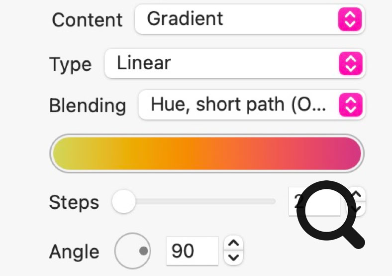 Im Farbwähler können Sie die beiden Enden eines Verlaufs auswählen oder bei einem mehrstufigen Verlauf jede einzelne Farbstufe. Außerdem kann der Verlauf linear (in Richtung des Winkels), radial (vom Zentrum zu den Rändern) oder konisch (ein kreisförmiger Verlauf, der vom Winkel ausgeht) sein.
