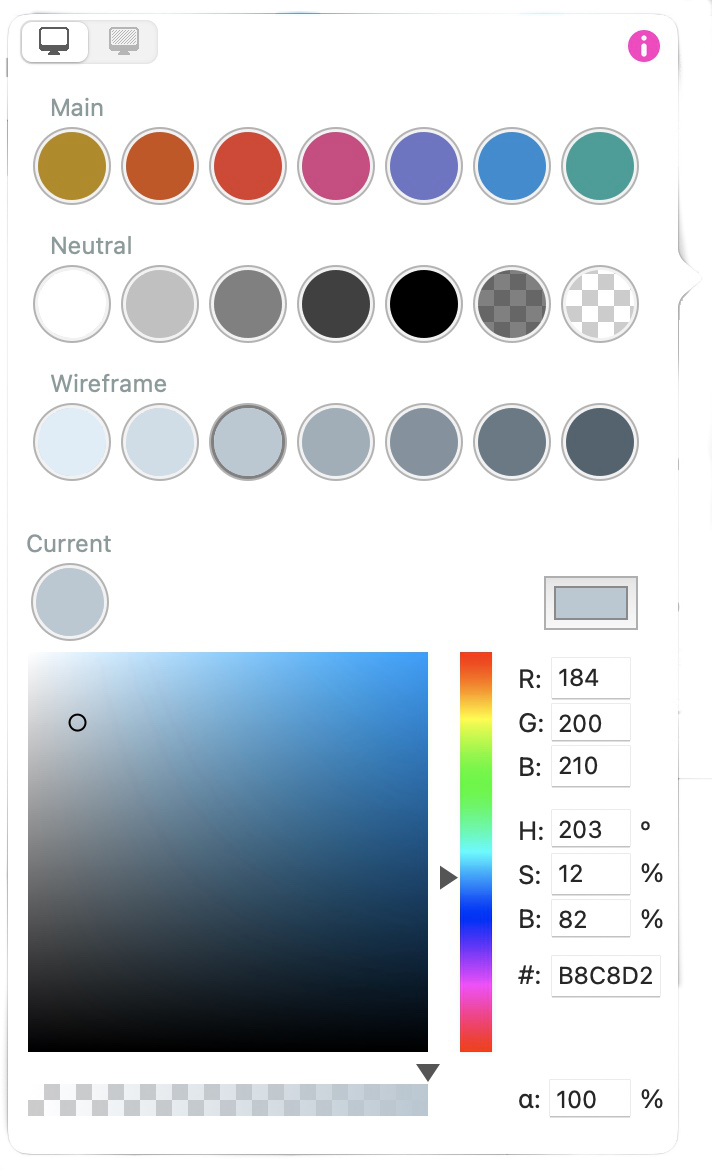 Im hier gezeigten Beispiel haben wir ein Sitely-Farbfeld, das für die Verwendung in anderen Mac-Apps erstellt und als benutzerdefiniertes Farbfeld gespeichert wurde. Bei geöffnetem Farbwähler wählen Sie einfach die Farbe aus, die Sie zu Ihrer Hauptpalette hinzufügen möchten. Ihre gewählte Farbe ersetzt die aktuell ausgewählte Hauptfarbe in der Hauptfarbpalette von Sitely. Sie können natürlich alle im Farbwähler angebotenen Werkzeuge verwenden, um neue Farben zu erzeugen, einschließlich des Pipetten-Werkzeugs: