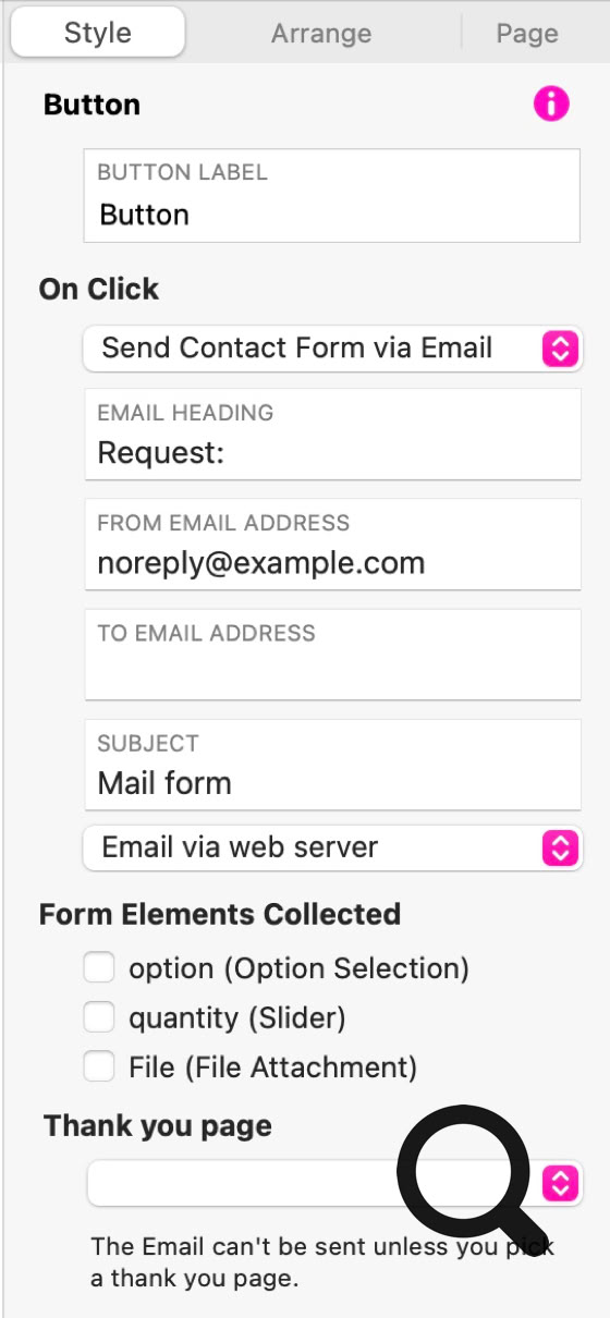 Die am häufigsten verwendete Methode zum Senden eines Formulars ist die Option Kontaktformular per E‑Mail senden. Diese Option sammelt alle Formulardaten von Ihrer Seite und übermittelt sie an Ihren Server, der sie an eine festgelegte E‑Mail-Adresse weiterleitet. Die gesamte Aktion wird über das Stil-Panel gesteuert, wenn Sie diese Versandmethode auswählen.