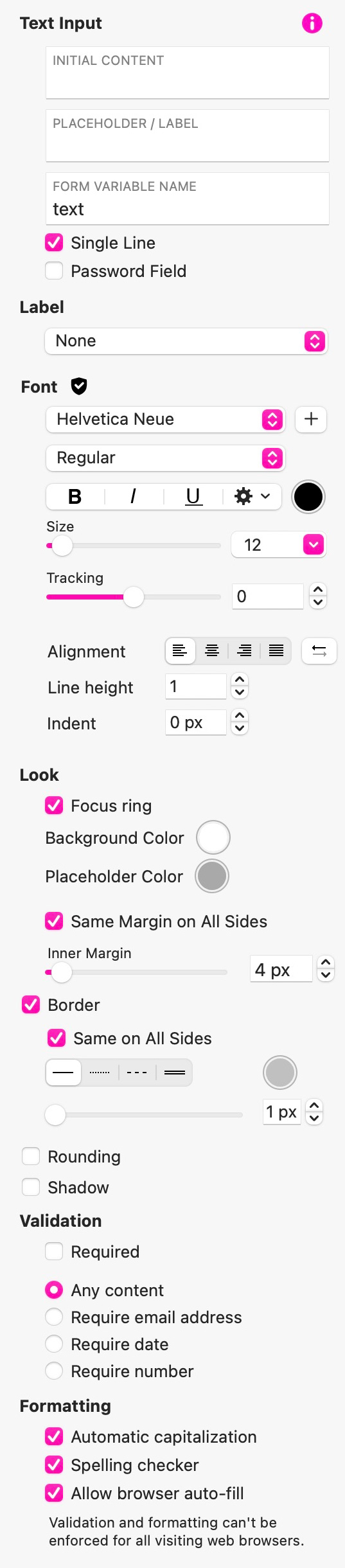 Validierung: Hier können Sie erzwingen, dass nur bestimmte Arten von Informationen in das Feld eingegeben werden. Sie können das Feld auch als Pflichtfeld kennzeichnen, bevor das Formular gesendet werden kann.