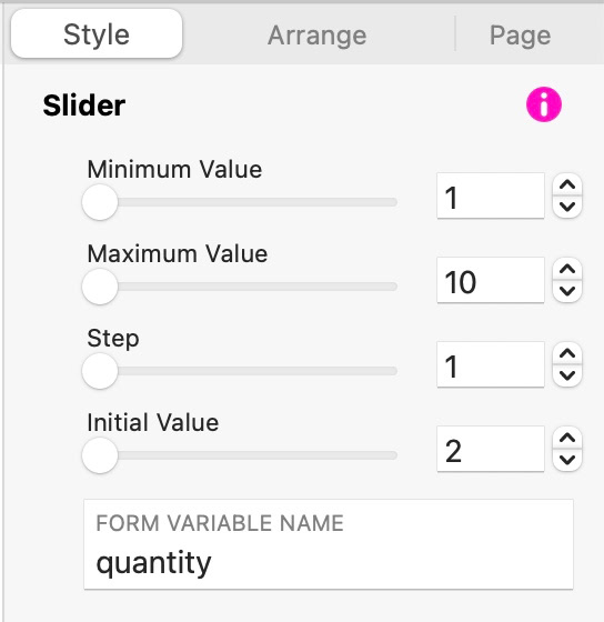 Die Werte werden im Stil-Panel festgelegt, indem Sie den Minimalwert, den Maximalwert, die Schrittweite und den Anfangswert des Schiebereglers definieren. Außerdem vergeben wir dem Schieberegler einen Formularvariablennamen – in diesem Beispiel verwenden wir die Variable quantity. Wenn das Formular gesendet wird, zeigt die E‑Mail den Variablennamen gefolgt vom vom Nutzer ausgewählten Wert. Das sieht in etwa so aus: quantity: 2.