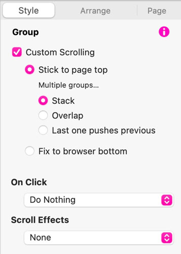 Nachdem eine Gruppe erstellt wurde, können Sie benutzerdefinierte Scroll-Effekte anwenden. Diese erscheinen im Stilbedienfeld, wenn auf der Arbeitsfläche eine Gruppe von Elementen ausgewählt ist.