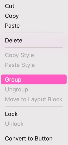 Um eine Gruppe zu erstellen, wählen Sie einfach alle Elemente aus, die in die Gruppe aufgenommen werden sollen. Das können Sie tun, indem Sie mit gedrückter Maustaste einen Rahmen über die Elemente ziehen, bis alle markiert sind, oder indem Sie mit Shift- bzw. Cmd-Klick nacheinander jedes Element auswählen. Sind die Elemente ausgewählt, klicken Sie mit der rechten Maustaste und wählen im Kontextmenü „Gruppieren“.
