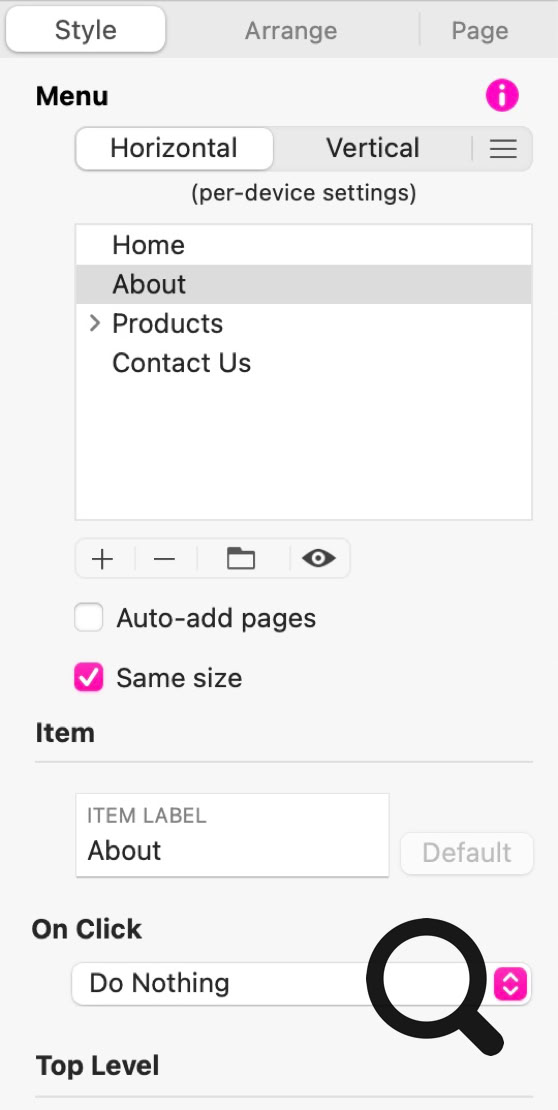 Hinweis: Wenn Sie ein Icon verwenden möchten, löschen Sie die Menübeschriftung im Stil-Panel, damit sie nicht unter oder über Ihrem Icon angezeigt wird.