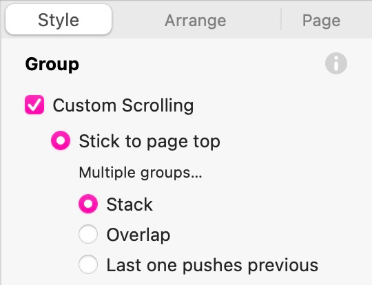 Er besteht aus einem Logo-Bild mit einer On‑Click‑Aktion, die zur Startseite führt, einer Telefonnummer mit On‑Click‑Aktion zum Anrufen, einer durchgängigen Hintergrundfläche und dem Menüelement selbst mit all seinen Seitenlinks. Diese Elemente wurden zu einer Gruppe zusammengefasst, sodass sie als ein einziges Element auf der Seite positioniert werden können. Als gruppiertes Element kann es zudem am oberen Seitenrand angeheftet werden, sodass es beim Scrollen sichtbar bleibt. Richten Sie dies ein, indem Sie die Gruppe auf dem Canvas auswählen und im Stil-Panel die Option Benutzerdefiniertes Scrollen aktivieren. Dadurch wird die Option Am oberen Seitenrand anheften sichtbar.