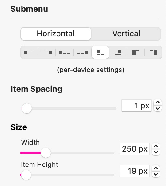 Als Nächstes kommen die Untermenüoptionen. Diese können je nach Gerät unterschiedlich eingestellt werden. Die erste Option legt die Position der Untermenüelemente in Relation zu den Top‑Level‑Links fest. Die Auswahl variiert je nach Menüt yp. Hier sehen wir die Optionen für ein horizontales Menü. Die Untermenülinks können oberhalb, unterhalb, links oder rechts des Top‑Level‑Elements positioniert werden. Die kleinen Symbole geben Ihnen eine grafische Darstellung der jeweiligen Option. In diesem Abschnitt lassen sich auch der Elementabstand sowie Breite und Höhe der Untermenüelemente festlegen.