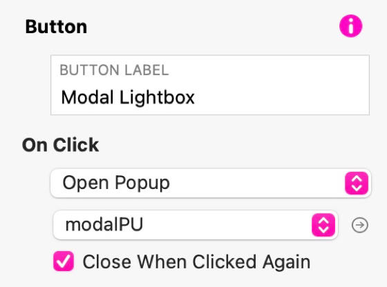 Bereits geöffnete Popups benötigen ebenfalls einen Auslöser, um sie zu verwerfen bzw. zu schließen. Auch dies kann über einen Link erfolgen, der das Popup schließt. In den meisten Fällen kann derselbe Link zum Öffnen und Schließen eines Popups verwendet werden. Aktivieren Sie dazu das Kontrollkästchen Beim erneuten Klicken schließen beim Öffnungslink.