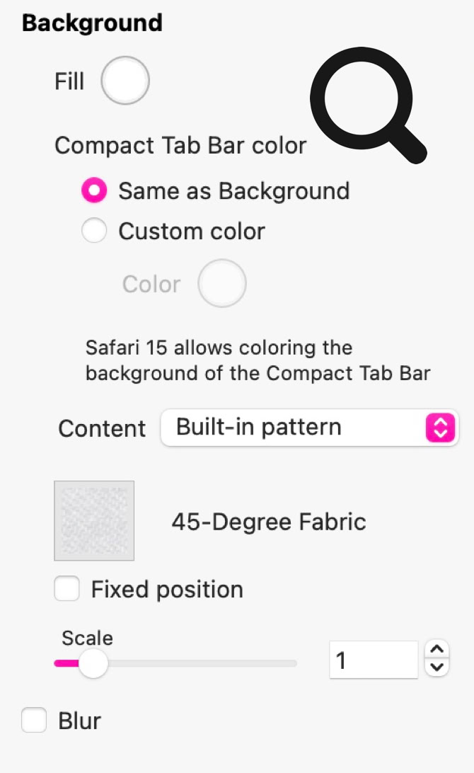 Mit diesen Optionen können Sie das visuelle Erscheinungsbild des Seitenhintergrunds festlegen. Im einfachsten Fall können Sie eine Hintergrundfüllfarbe wählen, die die gesamte Seite abdeckt. Über das Dropdown ‘Content’ können Sie jedoch ein Füllmuster oder einen Videohintergrund auswählen. Wenn Sie ein Füllmuster wählen, haben Sie die Wahl zwischen integrierten oder benutzerdefinierten Mustern. Außerdem können Sie festlegen, ob das Muster im Fenster fixiert ist (das Muster bleibt im Browserfenster statisch und Ihre Seite scrollt darüber) oder ob der Hintergrund zusammen mit dem Seiteninhalt scrollt. Weitere Optionen erlauben es Ihnen, das Muster zu skalieren oder zu verwischen. Wenn Sie einen Videohintergrund wählen, können Sie ein Video aus verschiedenen Quellen auswählen, einschließlich Videostreaming-Plattformen. Auch hier können Sie wählen, ob das Video im Fenster fixiert ist oder als Teil der Webseite mitscrollt. Wenn Sie die Option der fixierten Position wählen, füllt das Video das gesamte Browserfenster aus. Diese Hintergrundoptionen öffnen im Seitenbereich zusätzliche Einstellungen, die unten dargestellt sind.