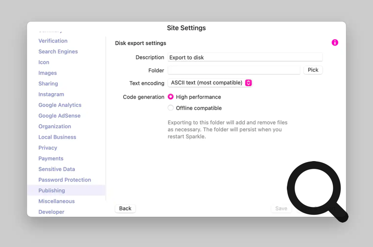 Der Export auf einen Datenträger ist unkompliziert. Sie werden aufgefordert, einen Ordner zu wählen und den Speicherort zu benennen. Zusätzlich können Sie die Textkodierung auswählen, um Nicht‑ASCII‑Zeichen im Webseiten‑Code darzustellen. Standardmäßig verwendet Sitely vorsorglich ASCII‑Text, Sie können jedoch UTF‑8 einstellen, um einen kompakteren Quelltext zu erhalten, sofern Ihr Server kompatibel ist.