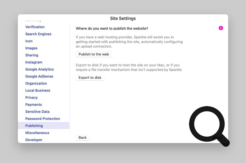 Ein Veröffentlichungsort speichert alle Einstellungen, sodass das Aktualisieren der Website mit einem einzigen Klick möglich ist. Sitely nutzt diese Ortsinformationen außerdem, um nur die Dateien zu veröffentlichen, die sich tatsächlich geändert haben.