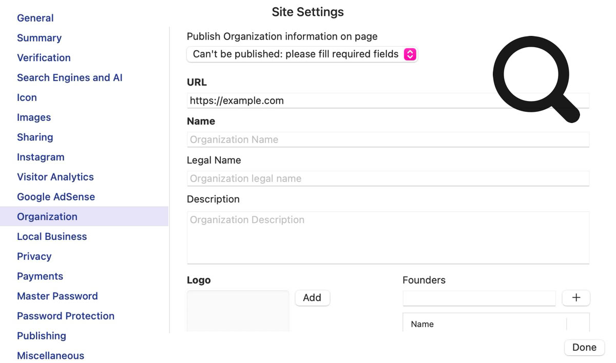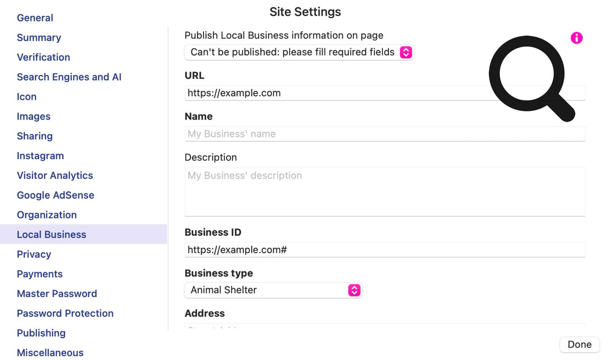 Die in diesem Bereich eingegebenen Informationen sind für Besucher nicht direkt sichtbar, sondern werden als sogenannte „strukturierte Daten“ gespeichert, die von Suchmaschinen gelesen werden. Diese Metadaten verbessern, wie Suchmaschinen Suchergebnisse zu Ihrer Website darstellen und sie mit anderen Web-Eigenschaften verknüpfen. Typischerweise werden sie in Google Maps verwendet, um Unternehmen und deren Standorte hervorzuheben.