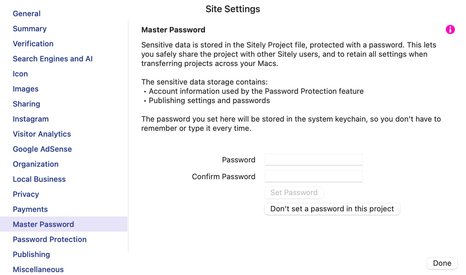 Hier können Sie das Passwort festlegen und ändern, das sensible Daten schützt, die in der Projektdatei gespeichert sind. Wenn Sie beispielsweise Ihre Projektdatei mit anderen (Mitarbeitenden oder Kundinnen und Kunden) teilen, sollen diese nicht auf Dinge wie E-Mail‑Passwörter oder FTP-Zugangsdaten stoßen. Mit den Optionen in diesem Bereich verhindern Sie unbefugten Zugriff auf diese sensiblen Informationen.