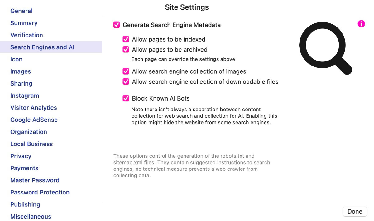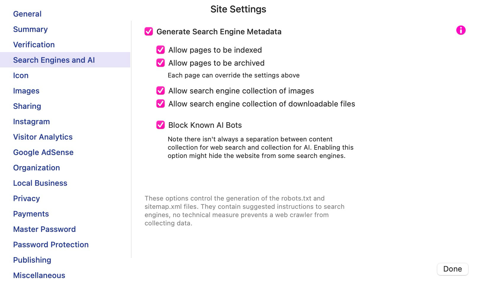 Suchmaschinen stützen sich auf Dateien wie 'sitemap.xml' und 'robots.txt', um die Struktur und den Inhalt Ihrer Website zur Indexierung zu verstehen. Dieser Abschnitt im Einstellungsbereich automatisiert die Erstellung dieser Dateien und vereinfacht den Prozess. Er gibt Ihnen die Möglichkeit zu steuern, wie Suchmaschinen mit Ihrer Website interagieren. Sie können festlegen, welche Seiten sie indexieren und für spätere Verweise speichern dürfen und ob sie auf Bilder und Download-Dateien zugreifen können. Diese Kontrolle stellt sicher, dass Suchmaschinen Ihre Website gemäß Ihren Präferenzen durchsuchen und nutzen.
