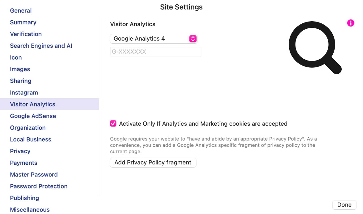 Hinweis: Das Weitergeben von Nutzerdaten an Dritte wie Google erfordert in der Regel eine ausdrückliche Einwilligung der Besucher Ihrer Website. Aktivieren Sie unbedingt die Option, die einen Datenschutzerklärungs-Baustein zu Ihrer Datenschutzseite hinzufügt. Siehe den Abschnitt „Datenschutz“ weiter unten auf dieser Seite.