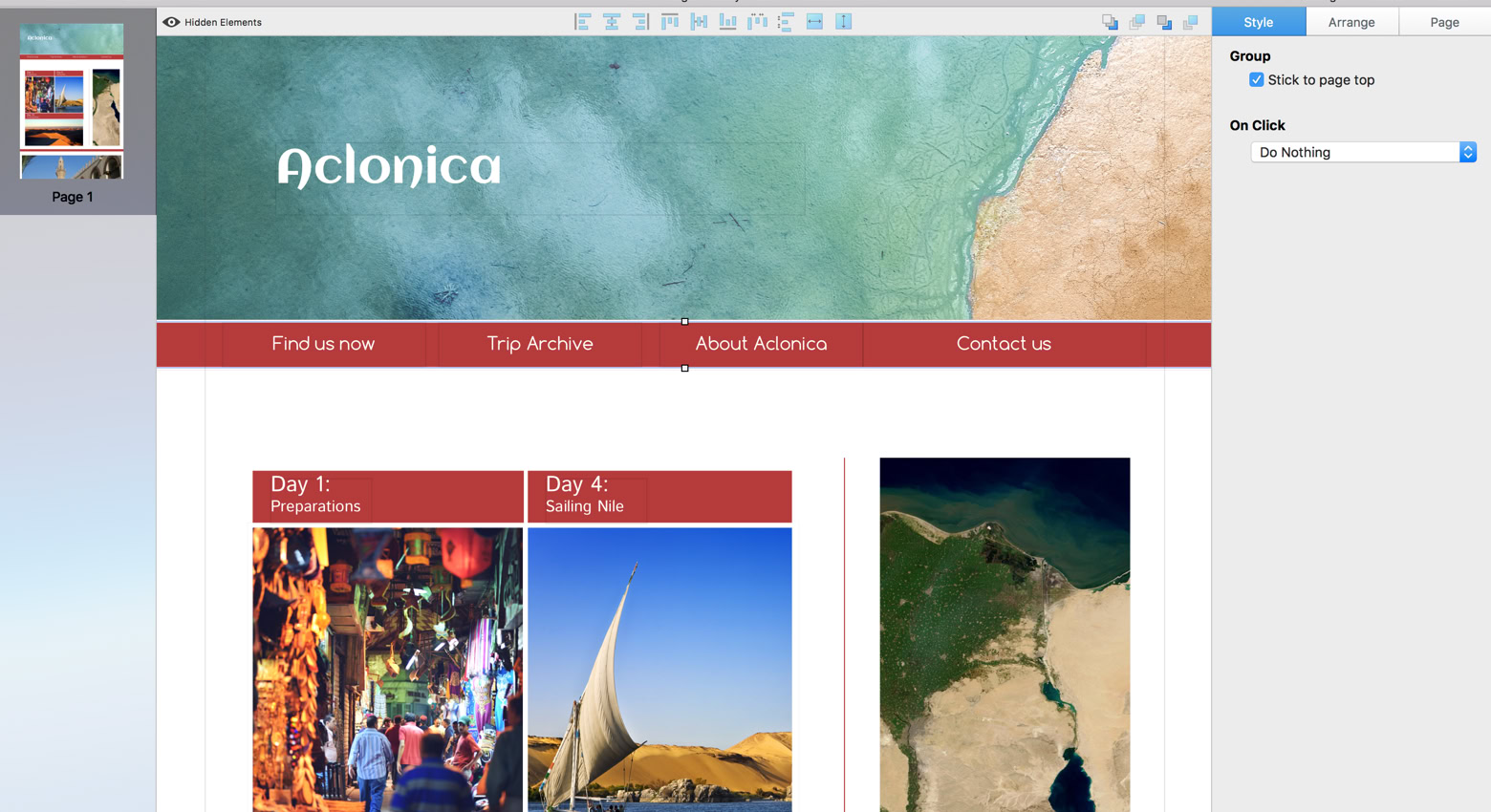 To create a simple header, begin by placing a few text buttons over a wide box. The buttons will be links to pages of your website, or to scroll locations on the same page. A number of 3 to 5 buttons is usually enough to highlight the main features of a website without overloading the bar. A menu element can work in lieu of buttons as well. Select all of the buttons and the wide box, right click to open the menu and select group, or select group from the Arrange menu at the top of the screen. The newly created group offers the stick to top option in the style tab.