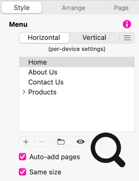 What Sitely has done is gathered up your page and group names and created the menu for you. Furthermore, if you create additional pages and/or groups later on, they can be automatically added to the menu as you build your site., Just be sure that the Auto Add Pages box is checked in the style panel. The option becomes visible in the style panel when you select the menu on the canvas.