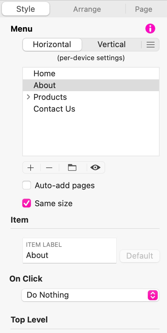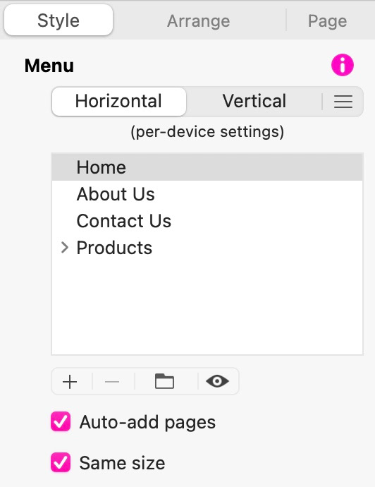 If you don’t want to create your pages and page groups at the outset, you can manually create your menu to give you greater control over your navigation structure. You do this by adding the menu element to the canvas and deselecting the Auto-Add Pages checkbox in the style panel. You will then be free to add pages and groups manually.