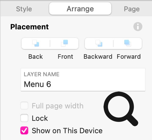Having created a menu, Sitely allows you to decide where and on what devices it should be displayed. This is all done in the Arrange panel. With the menu selected on the canvas, pop over to the Arrange tab to see all the available options.