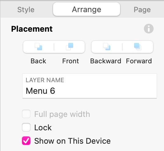 The Placement section allows you to choose to show the menu on the device you’re currently working on. Deselecting this option will hide the menu on the current device only, but keep it visible on other devices.