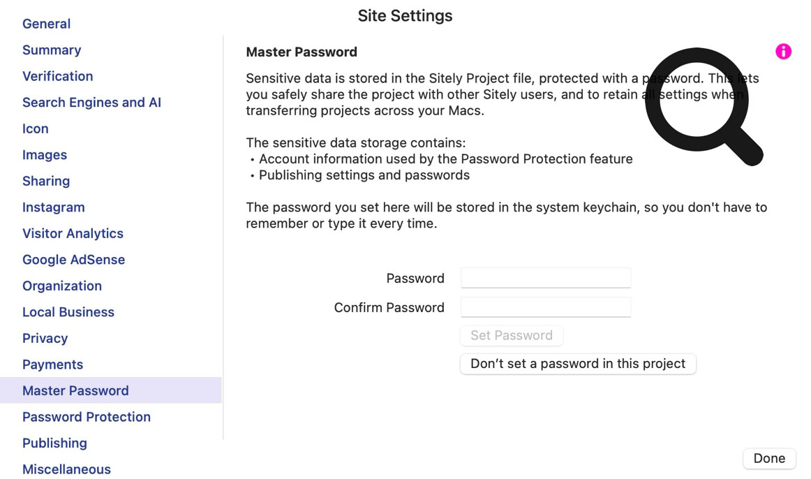 Aquí puedes establecer y cambiar la contraseña que protege los datos sensibles almacenados en el archivo del proyecto. Si, por ejemplo, compartieras tu archivo de proyecto con otras personas (colaboradores o clientes), no querrías que nadie descubriera cosas como contraseñas de correo electrónico o credenciales de acceso FTP. Al usar las opciones de este panel, puedes impedir el acceso no autorizado a esta información sensible.