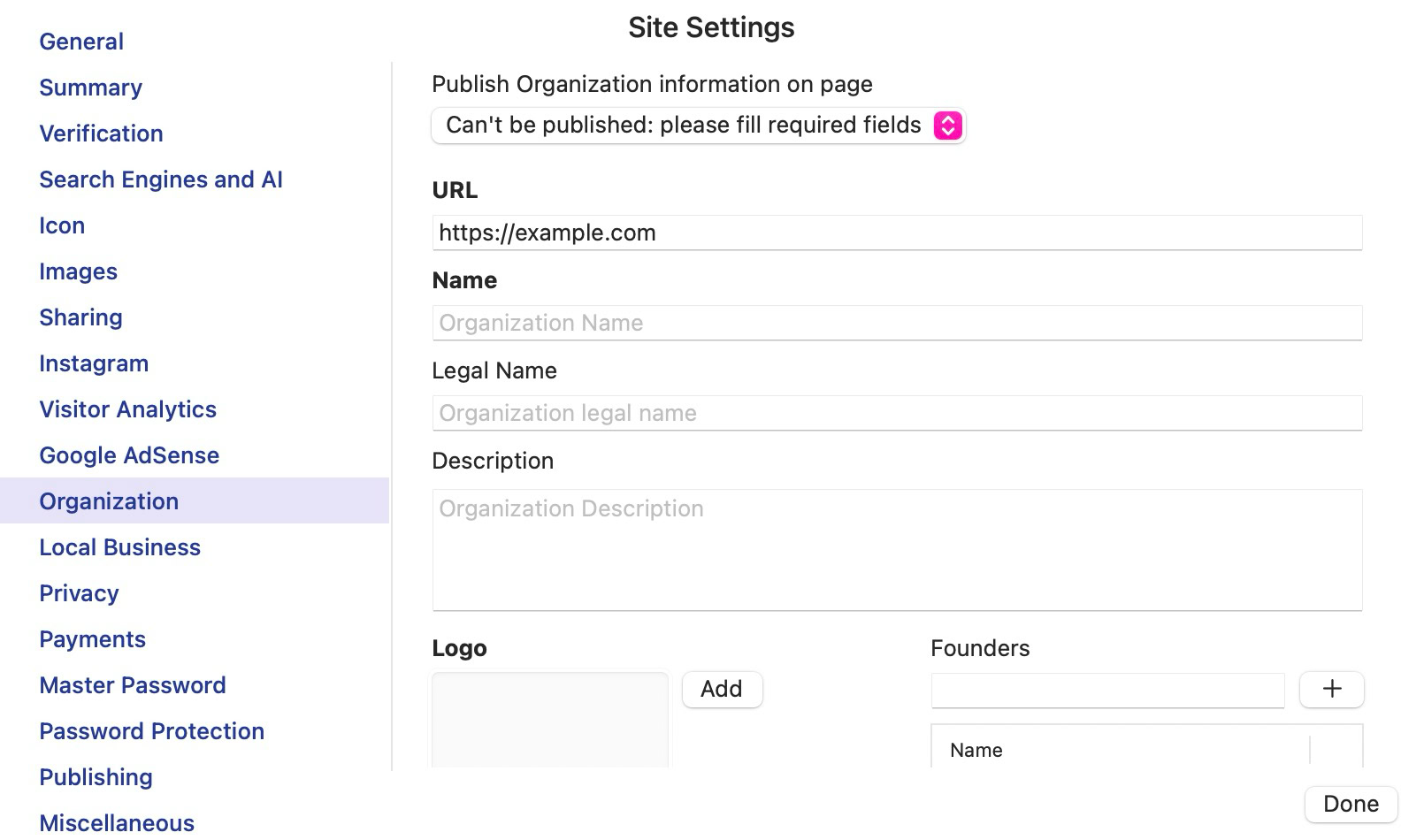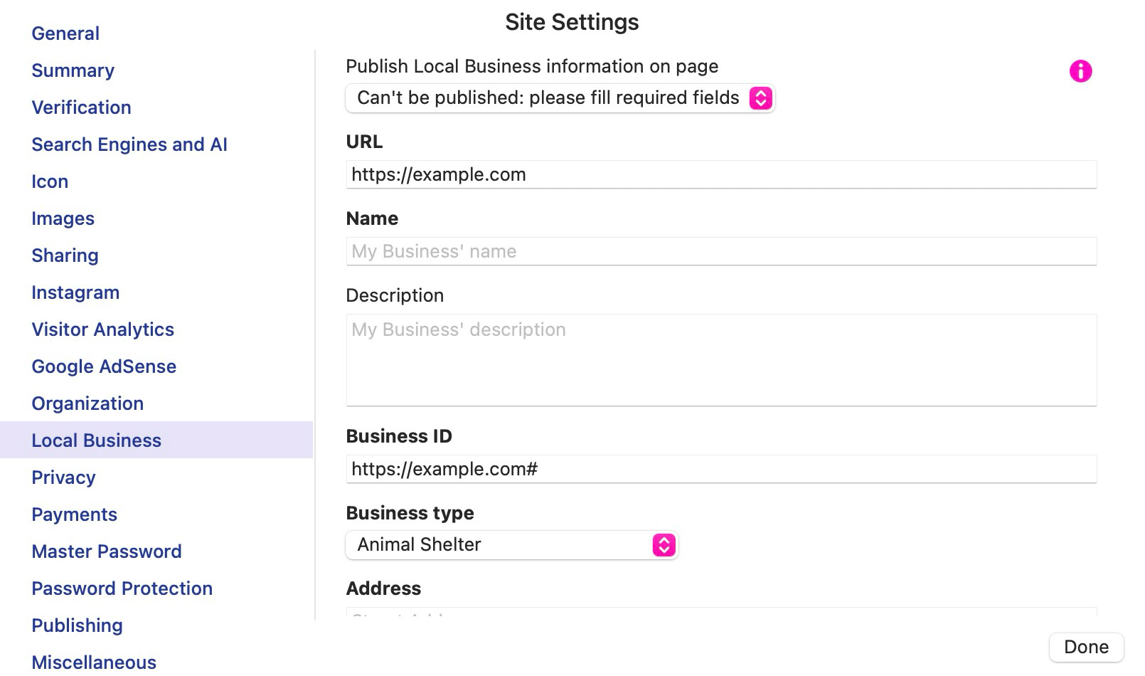 La información introducida en este panel no será visible directamente para los visitantes del sitio; en su lugar, se almacena como los llamados “datos estructurados” que leen los motores de búsqueda. Estos metadatos mejoran cómo los motores de búsqueda muestran los resultados sobre tu sitio web y lo conectan con otras propiedades web. Suele utilizarse en Google Maps para destacar negocios y sus ubicaciones.