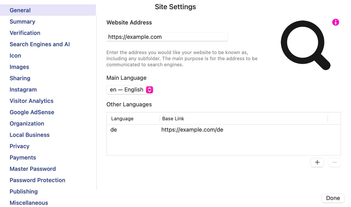 Esta sección incluye la dirección del sitio web y el idioma. La dirección es importante para los motores de búsqueda y para compartir. El idioma del sitio web ayuda a los motores de búsqueda y a los visitantes no humanos a entender el sitio sin tener que deducirlo del texto. Puedes añadir varios idiomas aquí si estás creando un sitio multilingüe. Al añadir todas tus opciones de idioma, los motores de búsqueda estarán mejor preparados para mostrar tu sitio en los resultados de búsqueda según el idioma del visitante del sitio.