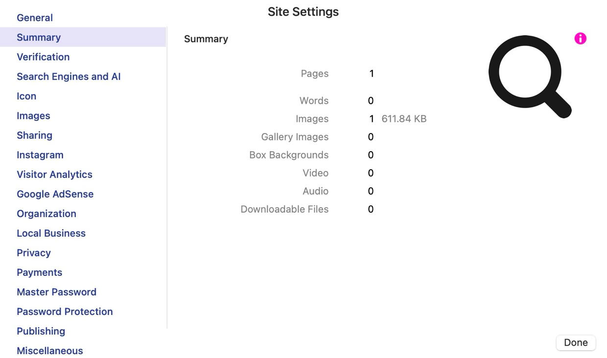 La sección de resumen es realmente solo para tu información. Presenta detalles sobre lo que contiene tu sitio en términos de páginas, palabras, imágenes, etc. A esto se le denomina colectivamente ‘Website Assets’ (recursos del sitio web). Aquí no hay nada que debas cambiar, ya que la información se genera automáticamente a partir de tu proyecto.