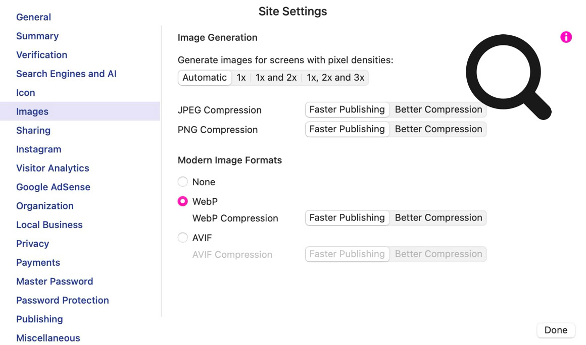 La opción "Better Compression" de Sitely optimiza los niveles de compresión para imágenes JPEG, WebP y AVIF y utiliza algoritmos lentos para imágenes PNG para reducir el tamaño manteniendo la calidad. En conjunto, esto mejora el rendimiento del sitio y la experiencia del usuario.