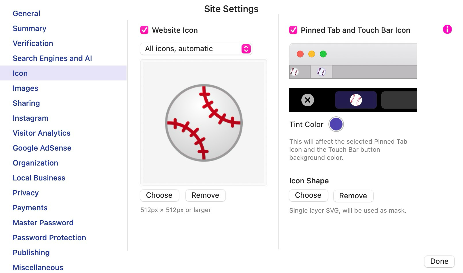 Aquí personalizas el icono del sitio (favicon) que se muestra en distintos navegadores. Puedes elegir una única imagen escalada a diferentes tamaños o controlar iconos individuales. Este icono también se usará si los visitantes guardan tu sitio en sus favoritos o en la pantalla de inicio en móviles y tabletas.
