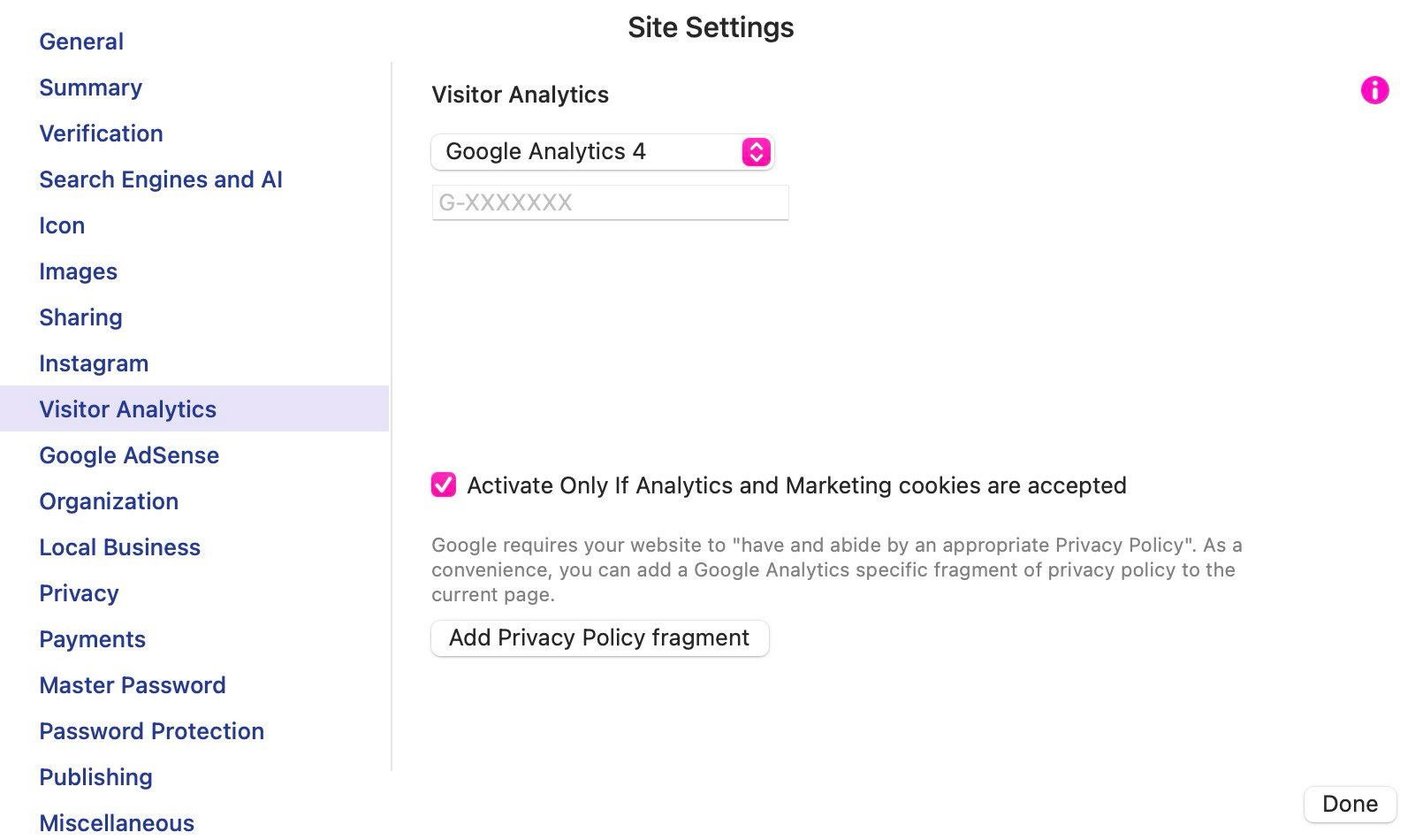 Activa el seguimiento de Google Analytics introduciendo tu identificador de Google Analytics, Tag Manager, Meta Pixel o Matomo. Solo una opción de analítica está activa a la vez. Necesitarás cuentas de analítica para esta opción..