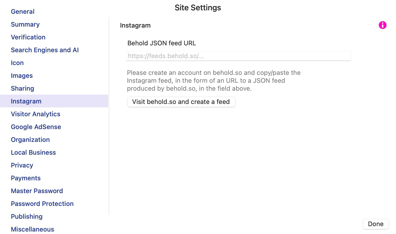 Habilitar esta opción permite a Sitely incorporar funciones de compartición de publicaciones con tu cuenta de Instagram. Por ejemplo, al colocar una imagen o una galería en tu lienzo, podrás capturar imágenes de tu cuenta de Instagram. También tendrás que habilitar esta opción para usar el elemento de Instagram de Sitely. La integración de Sitely se basa en el generador de feeds de Instagram de behold.so.