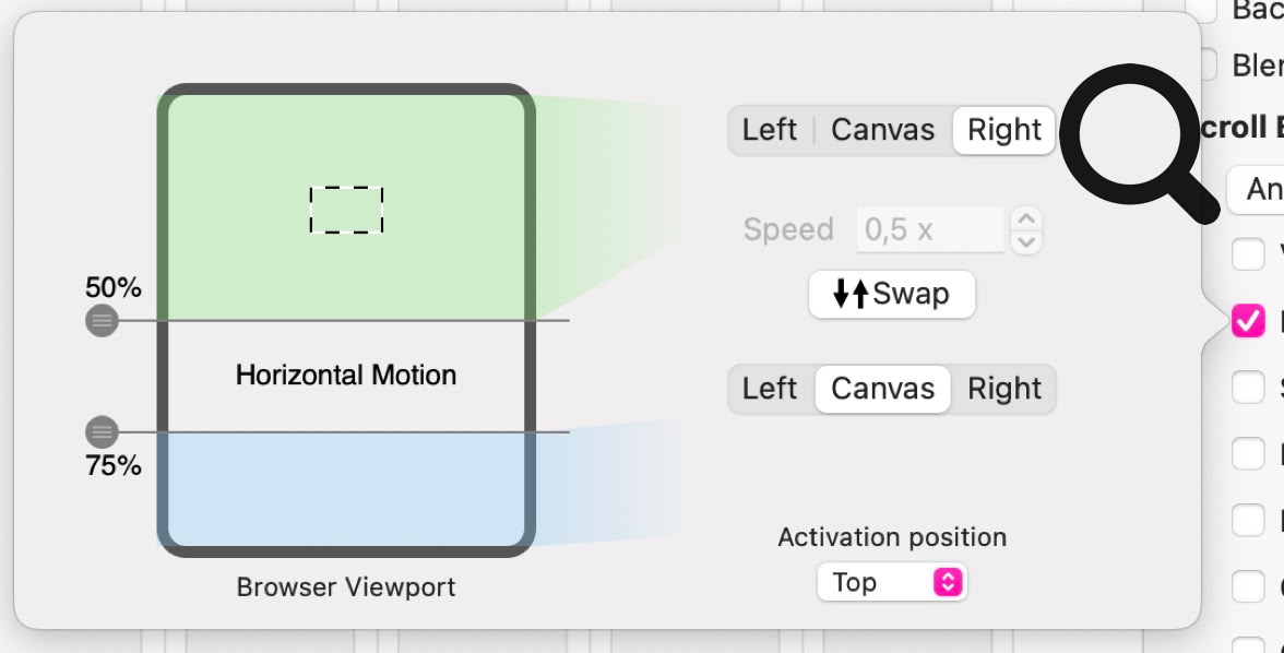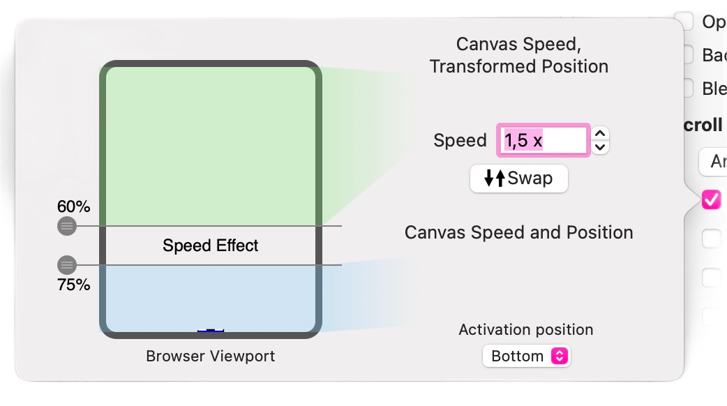 A la derecha de la ventana emergente están los ajustes específicos del efecto. De nuevo, en este ejemplo de una animación de movimiento vertical, hemos establecido una velocidad de 1,5 veces la velocidad del desplazamiento y hemos indicado a la animación que empiece cuando la parte inferior del elemento animado esté dentro de la ‘Ventana de acción’. ¿El resultado? Cuando la parte inferior del elemento cruza el marcador del 75%, el elemento comenzará su movimiento vertical hacia arriba hasta alcanzar el marcador del 60%. En ese punto, deja de moverse. Esto supone que el punto de partida del recorrido del elemento es la posición en la que se colocó en el lienzo. Pero ¿y si quisiéramos que comenzara su movimiento antes y terminara en su posición del lienzo? Para ello, haríamos clic en el botón ‘Intercambiar’ para invertir el efecto. Esencialmente, el elemento comenzará por debajo de su posición actual en el lienzo y se moverá hacia arriba hasta su posición en el lienzo. El punto en el que el elemento inicia su recorrido viene determinado por el marcador de la zona inferior.