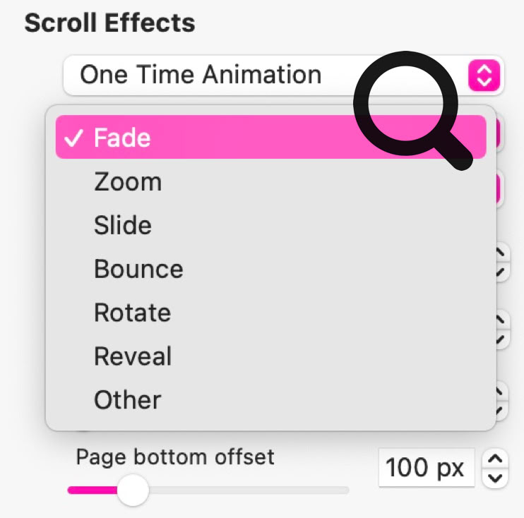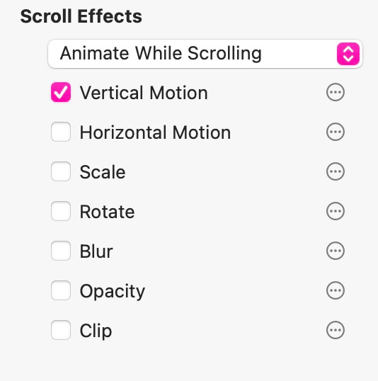Las animaciones de desplazamiento se aplican seleccionando la opción ‘Animar mientras se desplaza’ en la sección ‘Efectos de desplazamiento’ del panel de estilos. Allí encontrarás todos los efectos básicos de desplazamiento que se pueden aplicar a los elementos de tu lienzo. Solo selecciona un efecto y luego ajusta la configuración para lograr el resultado que quieras crear.