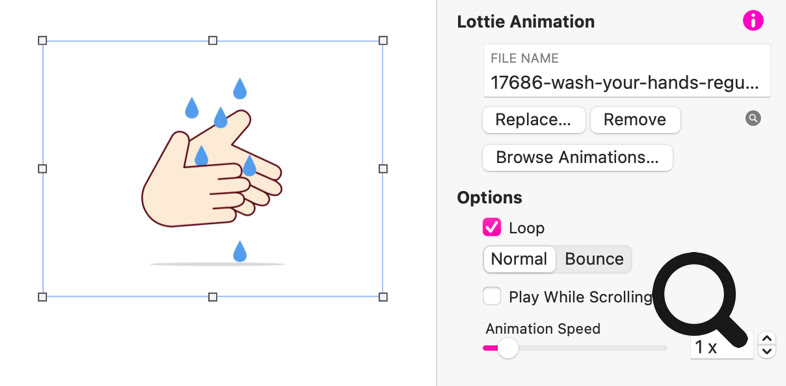 La animación Lottie también se puede configurar para reproducirse al desplazarse, y en ese caso el control de velocidad de la animación se convertirá en un multiplicador de velocidad, para controlar cómo el desplazamiento afecta al avance de la animación.