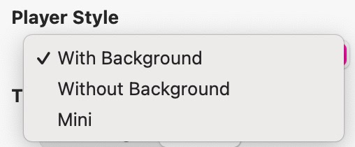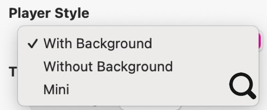 El reproductor también tiene tres estilos diferentes. Las opciones "Con" y "Sin" fondo son reproductores completos como se muestra arriba. La diferencia es que uno tendrá un color de fondo, mientras que el otro será transparente, permitiendo que se vea el color de fondo de tu página web. El estilo mini es solo un sencillo botón de reproducción que se ve así.