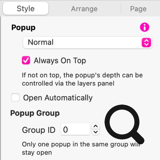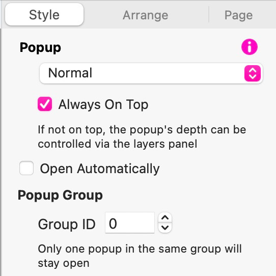 Si quieres crear un reproductor con una lista de reproducción integrada, es fácil en Sitely. En lugar de añadir el componente de audio directamente en la página, añádelo a ventanas emergentes (popups). Cuando agregues un reproductor de audio a un popup, verás un par de opciones adicionales en el panel de estilo: Iniciar cuando se abra el popup y Cerrar el popup al finalizar. Ambas opciones deben estar marcadas. Crea un popup por cada pista que quieras incluir en tu lista de reproducción. Asegúrate de que el tipo de popup esté configurado como "Normal" y de que TODOS tengan el mismo ID de grupo.