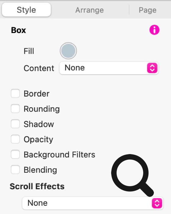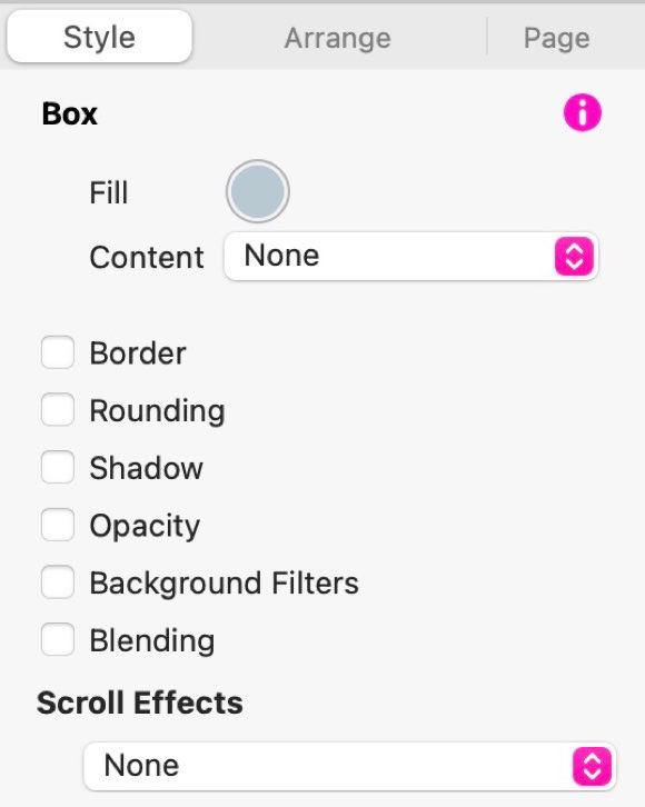 En Sitely tienes todas las herramientas de estilo que puedas desear para trabajar con cajas, y están convenientemente ubicadas en el panel Estilo, a la derecha de la interfaz de Sitely.