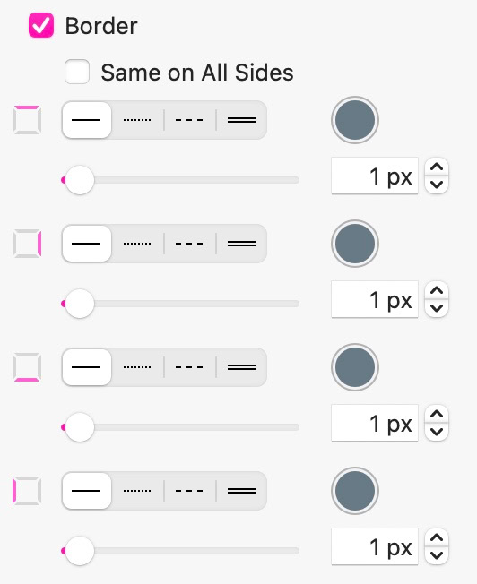Borde: Al seleccionar esta opción podrás aplicar un borde a tu caja. Puedes establecer el borde para que sea igual en todos los lados o definir un estilo/grosor/color diferente en cada lado de tu caja.